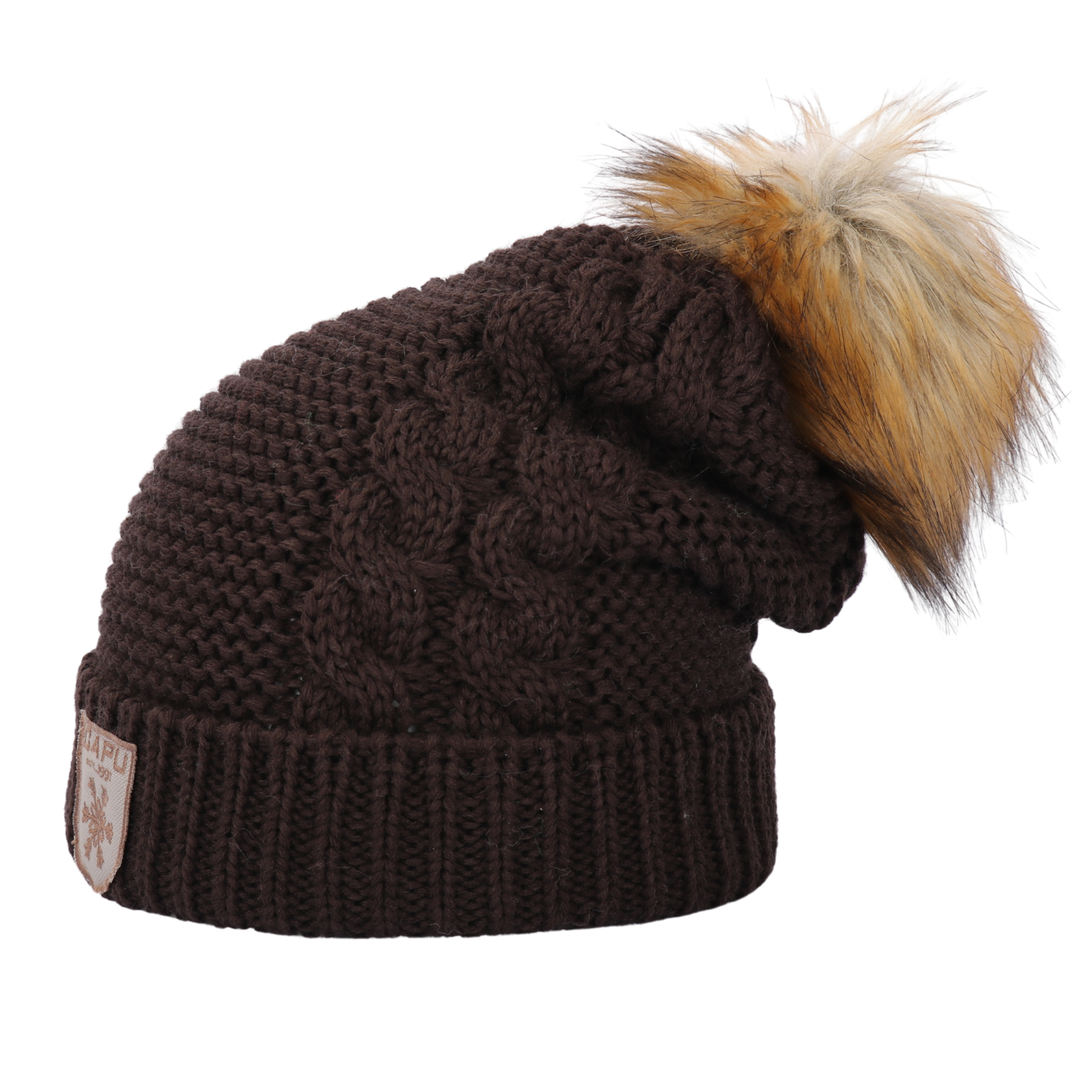 • Dámská pletená zimní čepice s kožešinovou bambulí přepadlá hnědá