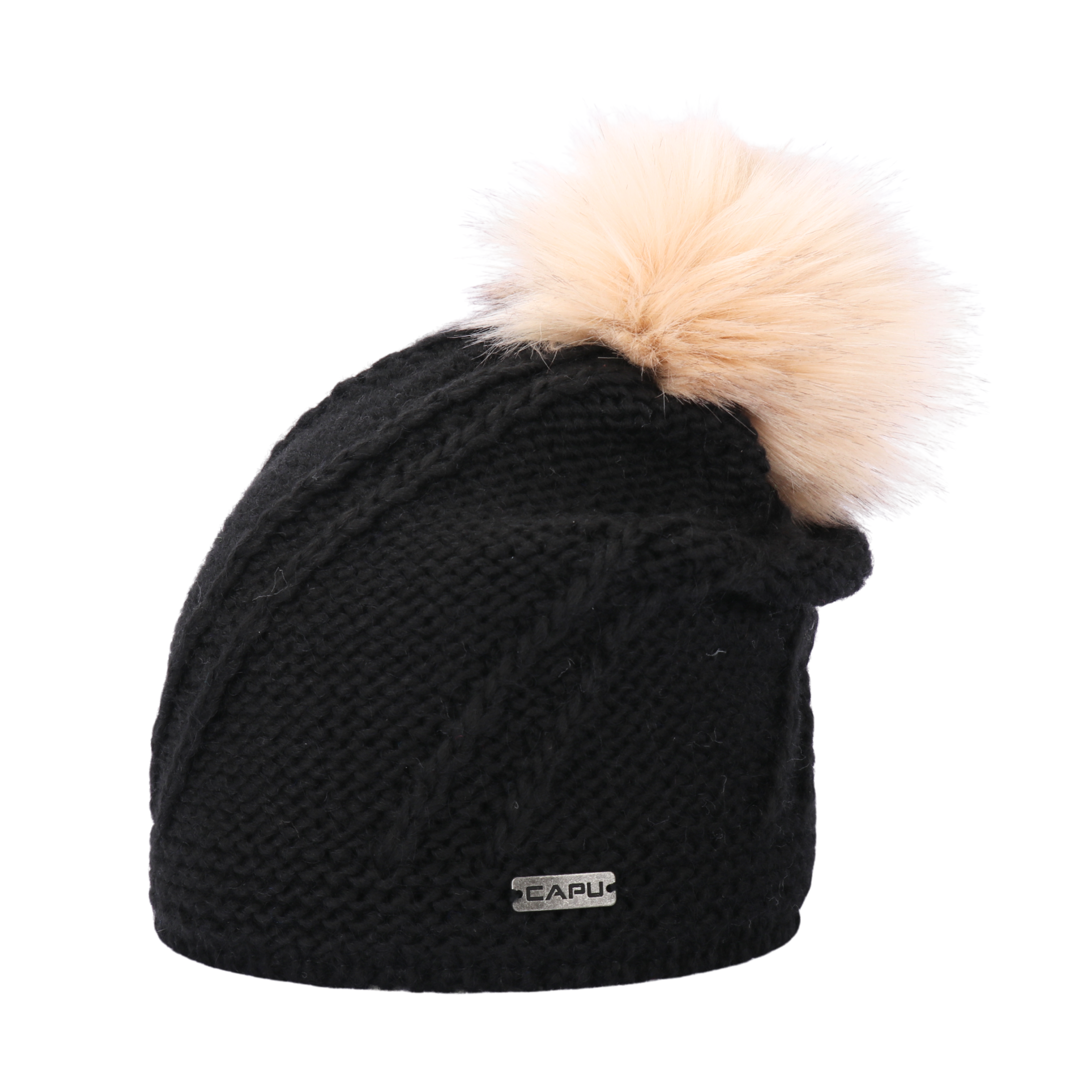 Dámská zimní pletená čepice s kožešinovou bambulí přepadlá– černá