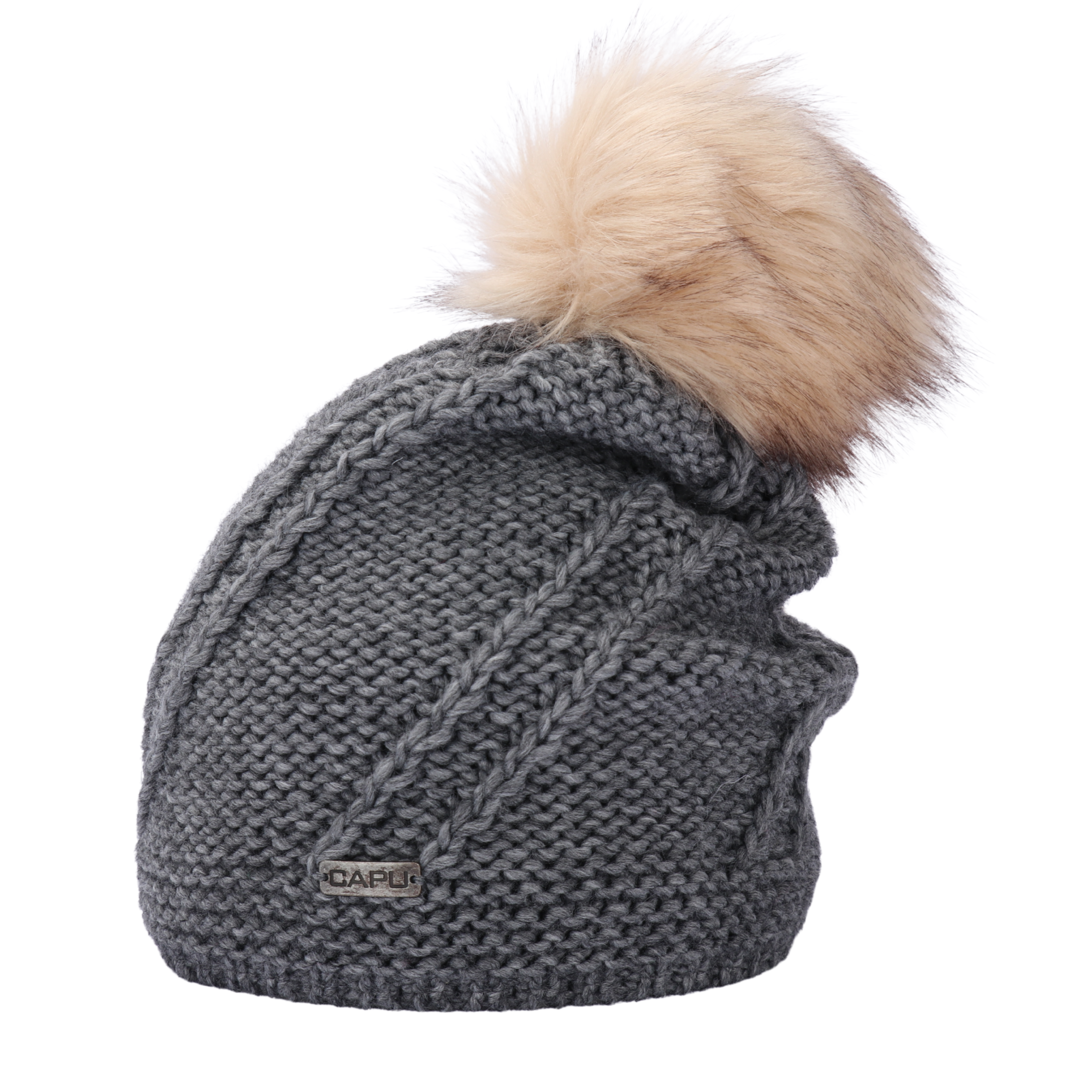 • Dámská zimní pletená čepice s kožešinovou bambulí přepadlá– šedá