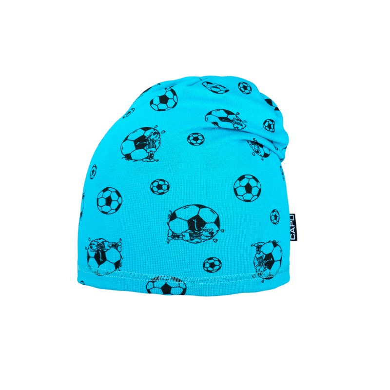 Dětská bavlněná jarní čepice s fotbalovým míčem, modrá, přepadlá – tenká jednovrstvá, velikost 52-54 cmSkladem159 Kč/ ks131 Kč bez DPH