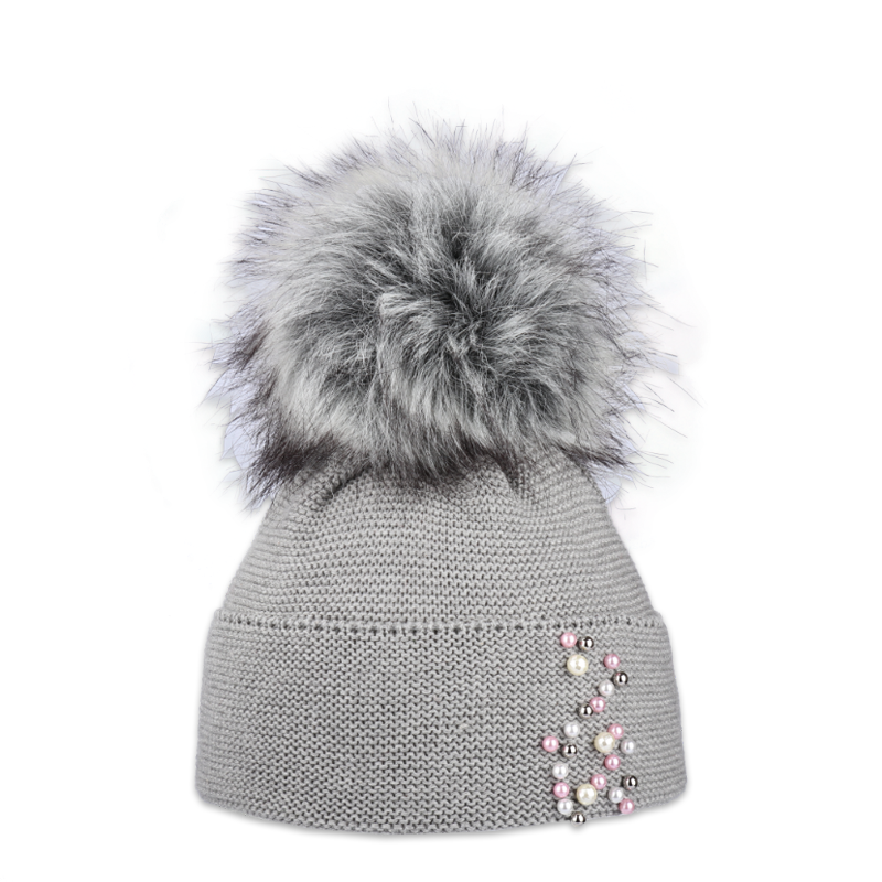 • Dětská čepice s kožešinovou bambulí s perličkami