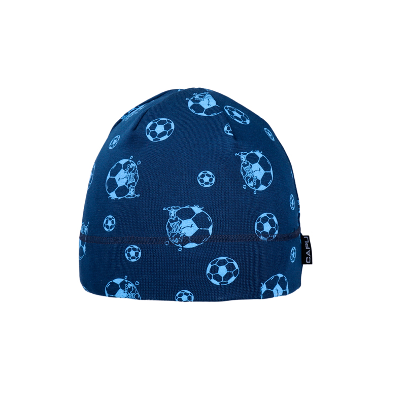 Dětská chlapecká jarní čepice s motivem fotbalového míče je ideální pro teplejší jarní a letní dny. Je ušitá z lehké jednovrstvé bavlny s elastanem, takže je příjemná na nošení, prodyšná a dobře se přizpůsobí obvodu hlavy dítěte.