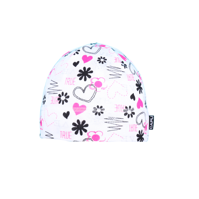 Dětská dívčí jarní čepice s motivem srdíček je ideální pro teplejší jarní a letní dny. Je ušitá z lehké jednovrstvé bavlny s elastanem, takže je příjemná na nošení, prodyšná a dobře se přizpůsobí obvodu hlavy dítěte.